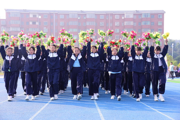 鮮花方陣緊隨之后,她們手捧花束向運(yùn)動(dòng)會(huì)獻(xiàn)禮,向在場(chǎng)的人們致意,鮮花洋溢著青春氣息。